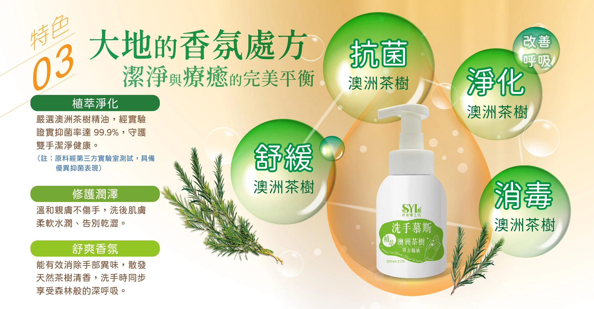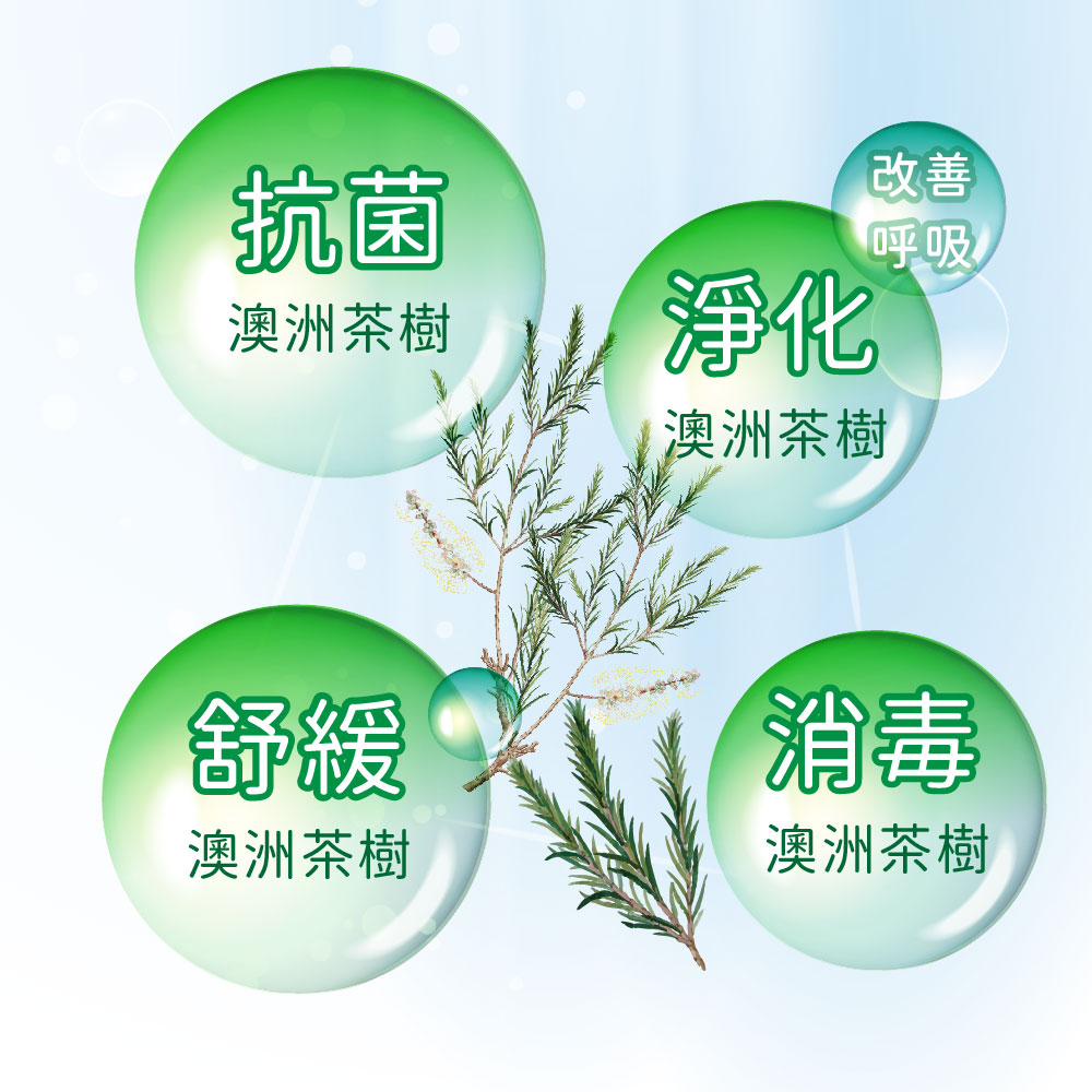 茶樹精油富含天然抗菌成分「4-松油醇」,有效清潔防護。 |