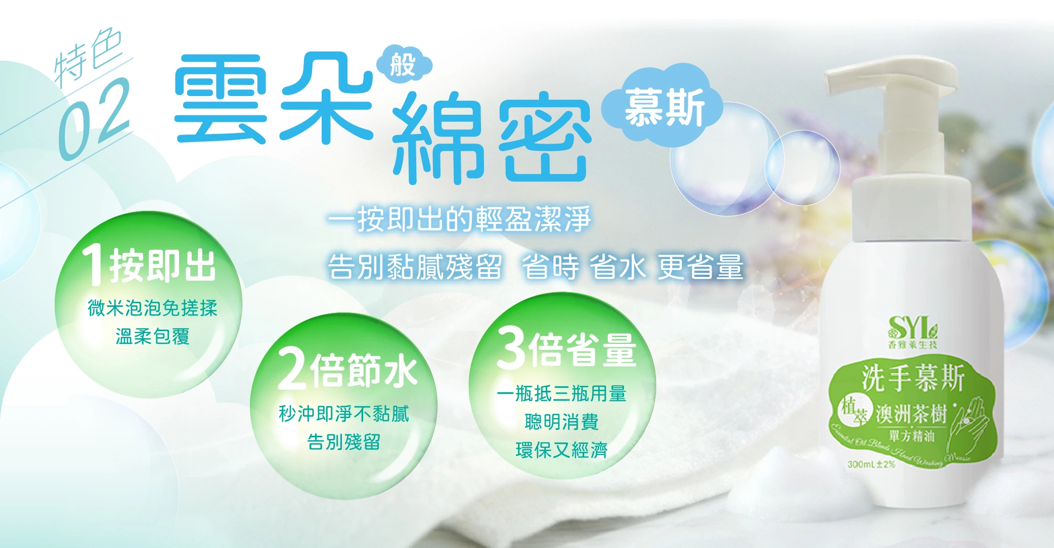 綿密泡沫慕斯設計,免搓揉、易沖洗,潔淨雙手更細緻柔嫩。 |