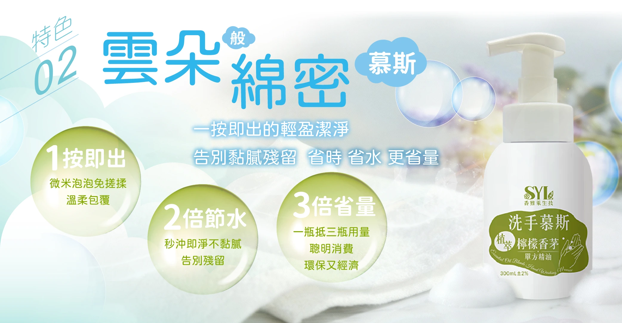 綿密泡沫慕斯設計,免搓揉、易沖洗,潔淨雙手更細緻柔嫩。 |