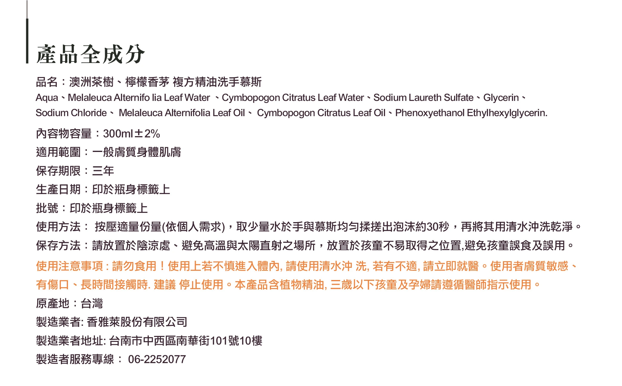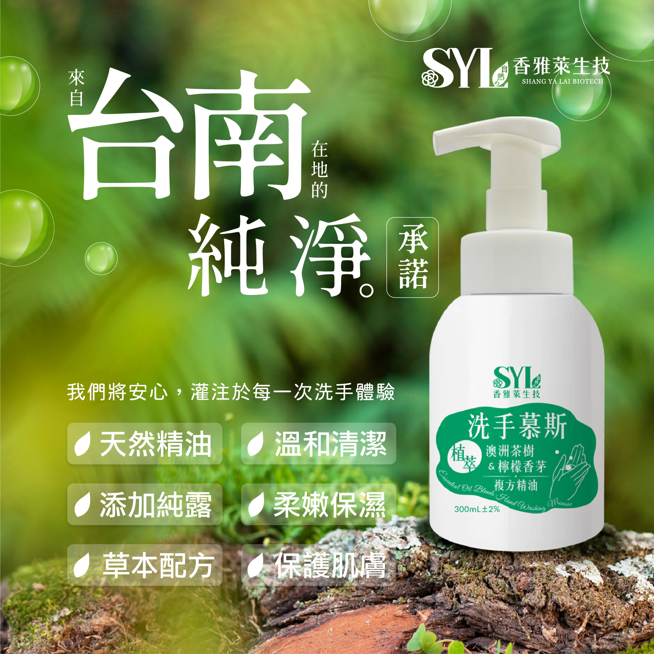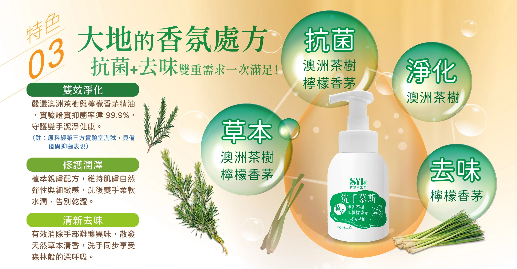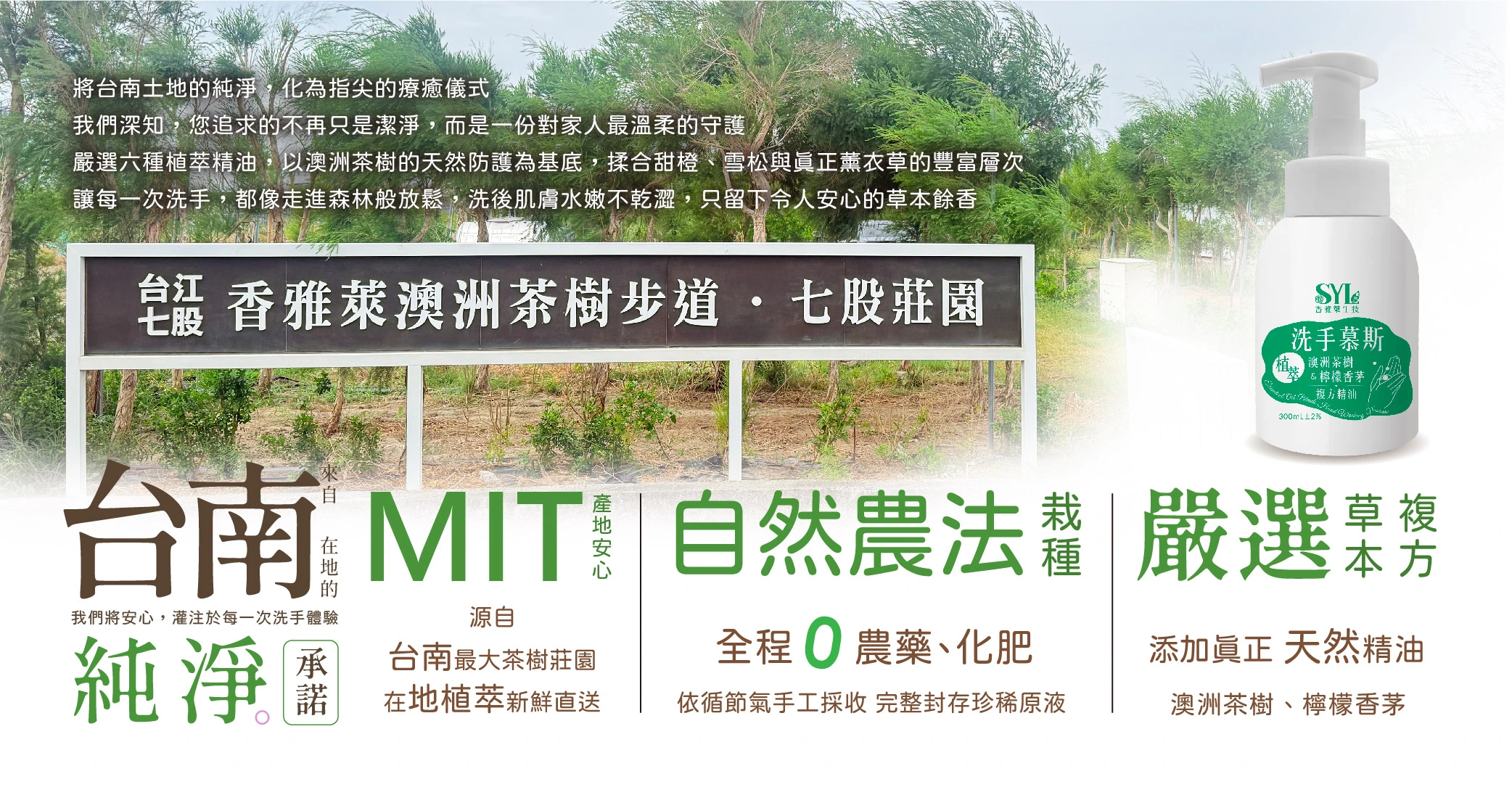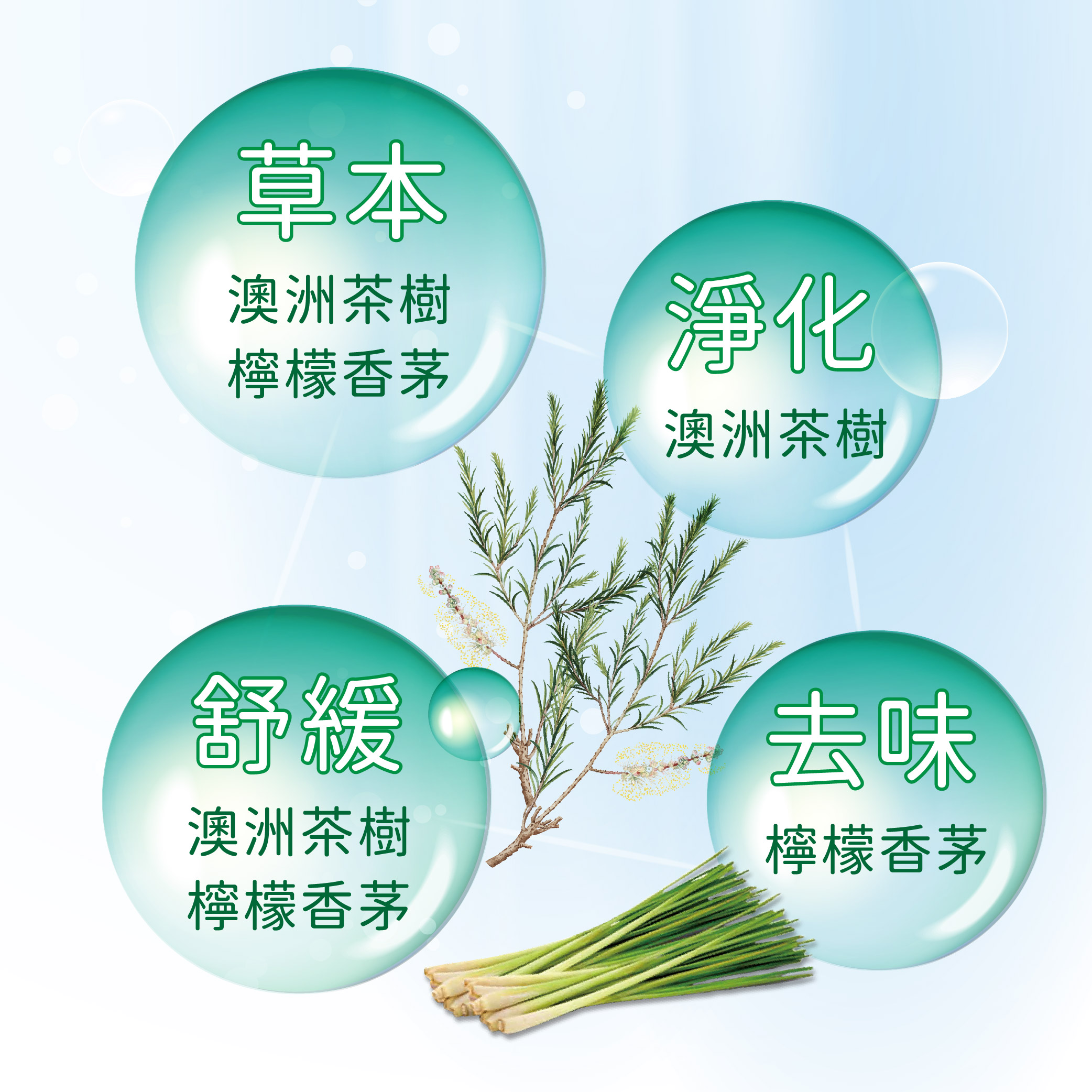 嚴選在地種植的澳洲茶樹與檸檬香茅,台南七股潟湖純淨萃取。 |