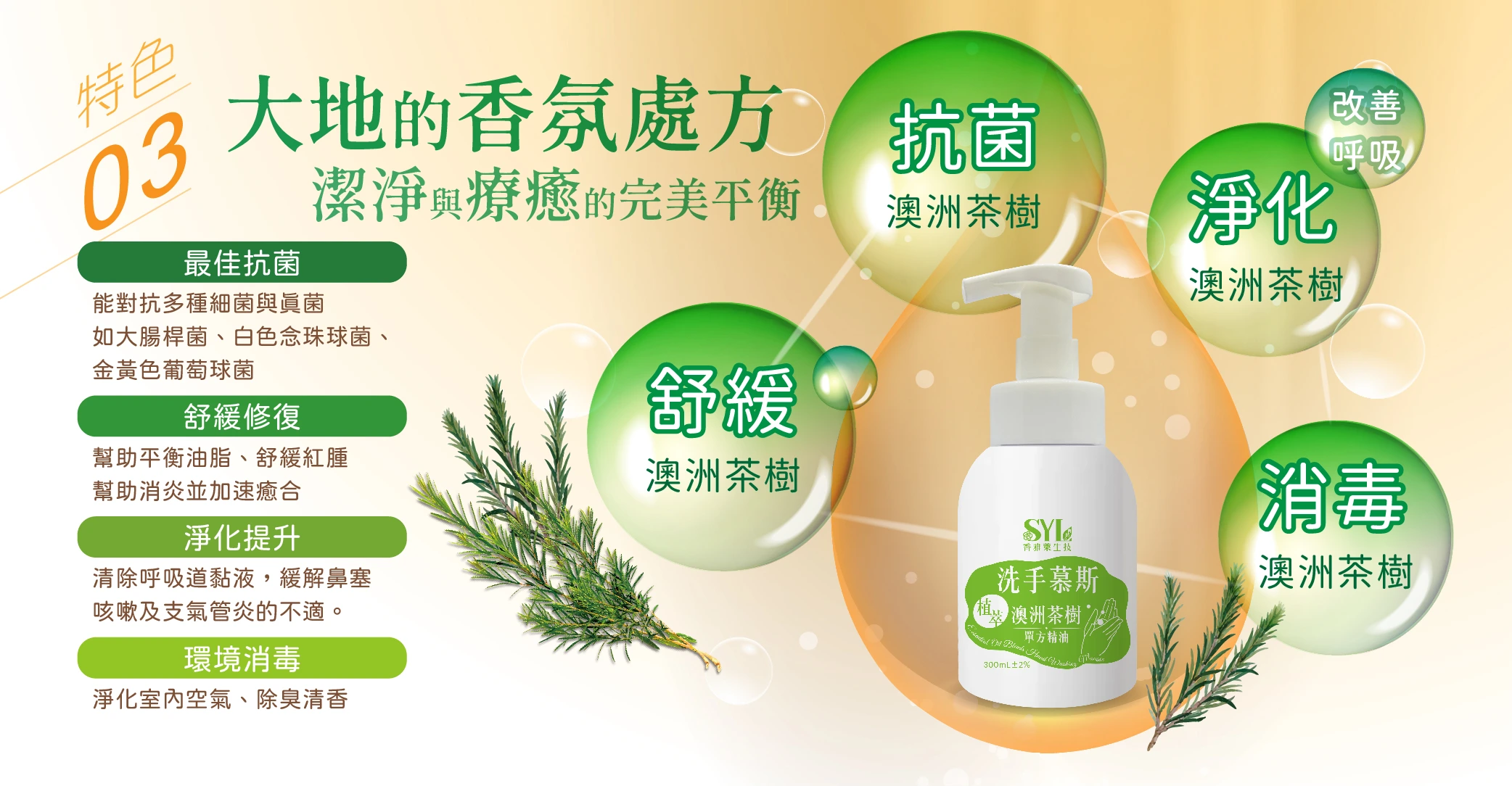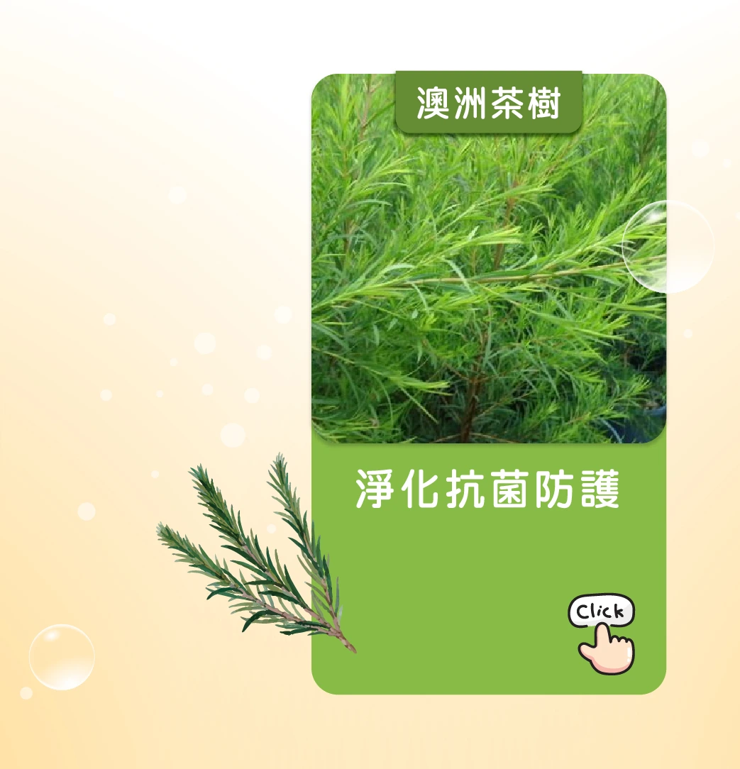 茶樹精油富含天然抗菌成分「4-松油醇」,有效清潔防護。 |